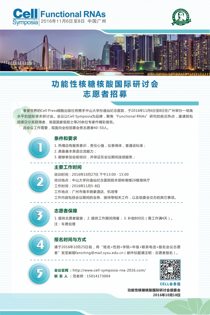 为促成学科合作,激发创新思维,yl23455永利集团孙逸仙纪念医院将联合Cell Press细胞出版社于2016年11月6日至8日在广州举办“功能性核糖核酸国际研讨会”。会议以Cell Symposia为品牌,聚焦“Functional RNAs”研究的前沿热点,内容包括: