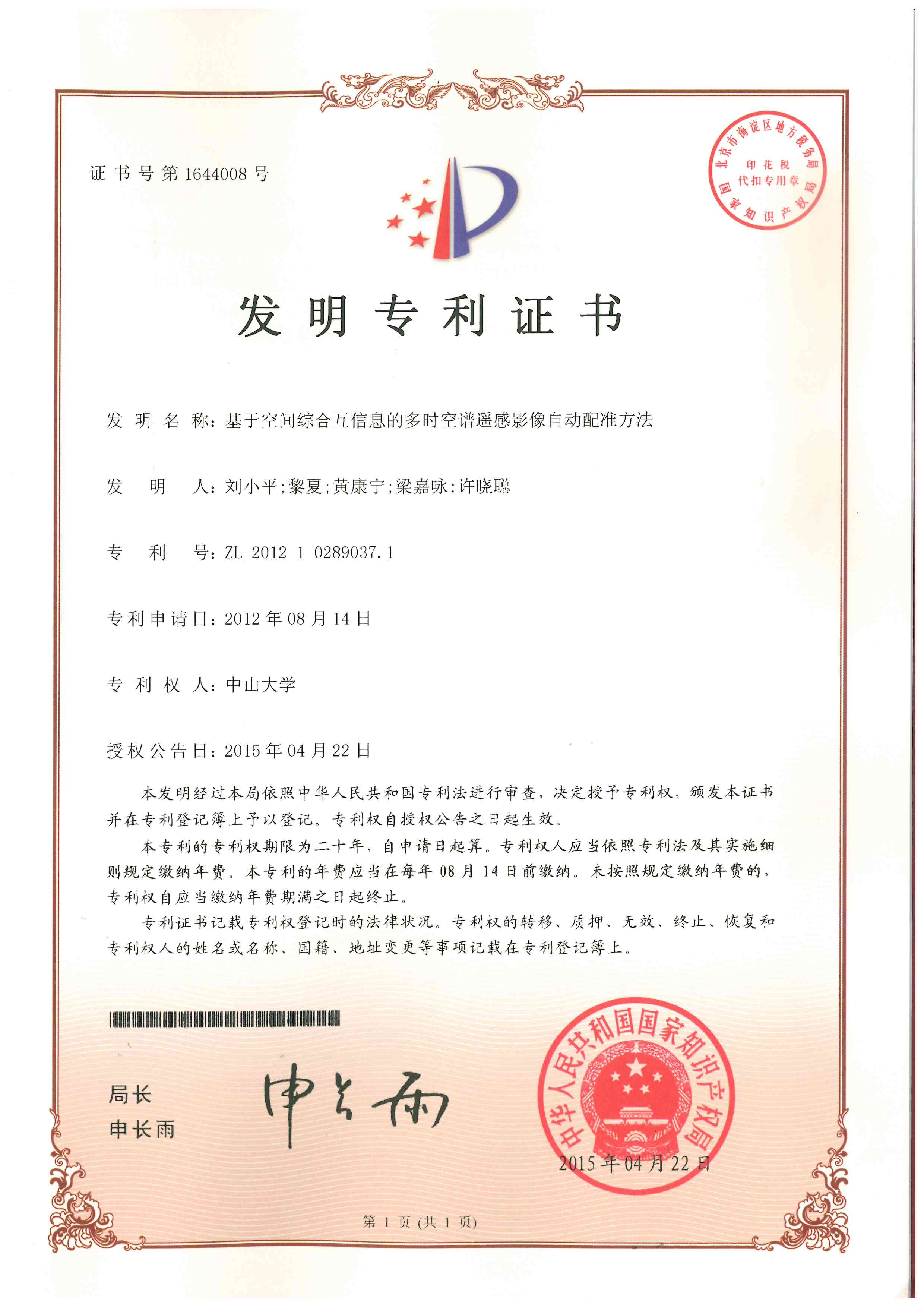 关于 “基于空间综合互信息的多时空谱遥感影像自动配准方法”专利权转让的公示