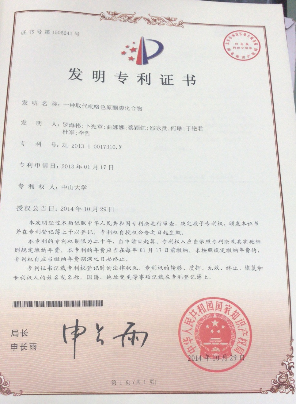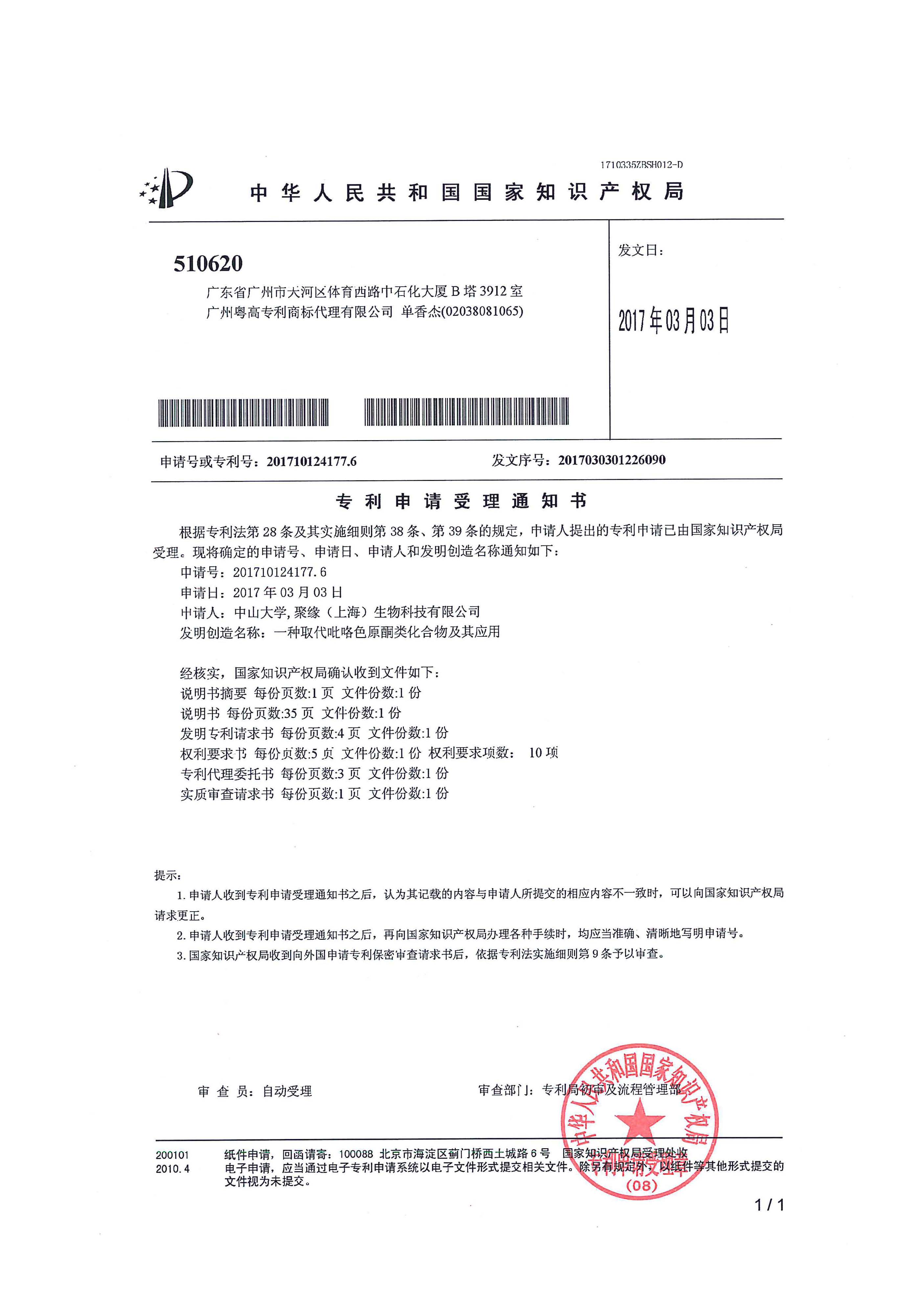 按照《yl23455永利集团科技成果转化实施办法》(中大科研〔2018〕15号)的规定,现将我校拟许可的“一种取代吡咯色原酮类化合物”等一项发明专利及一项发明专利申请的相关信息予以公示,公示期15日,自2019年7月31日至8月14日止。任何单位和个人如对转让有异议,可于2019年8月14日下午5:30前以书面形式送交科学研究院产学研合作处(地址:南校区中山楼新楼三楼7号)。异议应当签署真实姓名或加盖单位公章,并注明联系方式,逾期不予受理。