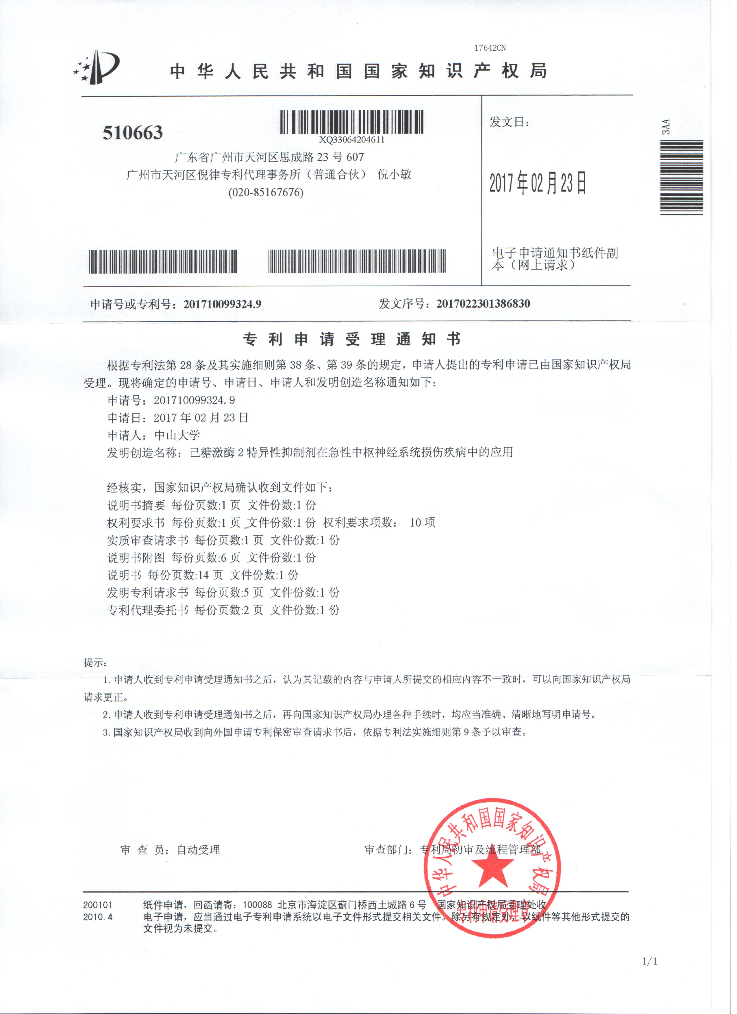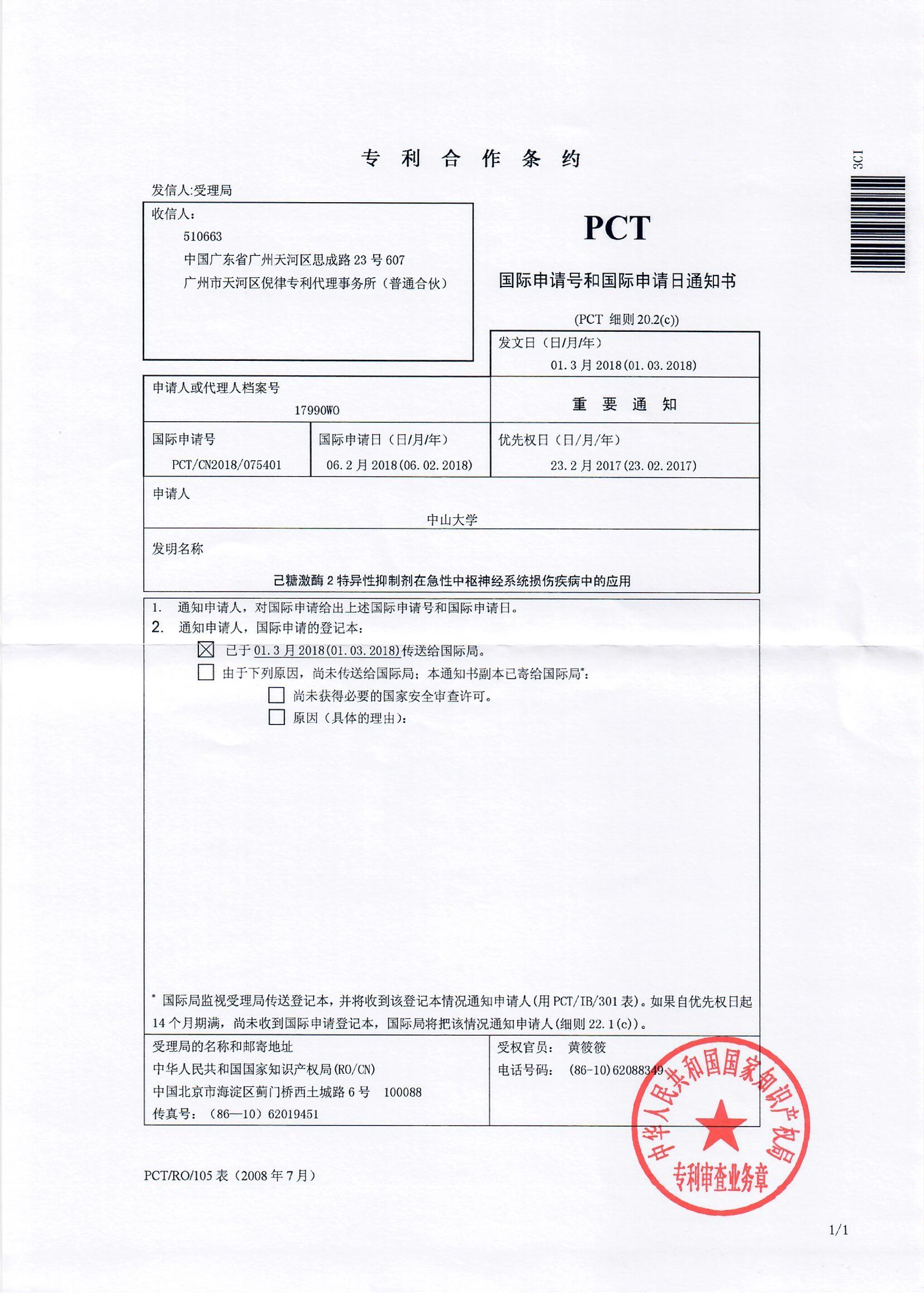 经委托由我校公开招标确定的七弦琴国家知识产权交易中心进行网上挂牌交易,按照《yl23455永利集团科技成果转化实施办法》(中大科研〔2018〕15号)的规定,现将我校拟转让的“己糖激酶2特异性抑制剂在急性中枢神经系统损伤疾病中的应用”等三项发明专利申请权的相关信息予以公示,公示期15日,自2019年7月8日至7月22日止。任何单位和个人如对转让有异议,可于2019年7月22日下午5:30前以书面形式送交科学研究院产学研合作处(地址:南校区中山楼新楼三楼7号)。异议应当签署真实姓名或加盖单位公章,并注明联系方式,逾期不予受理。