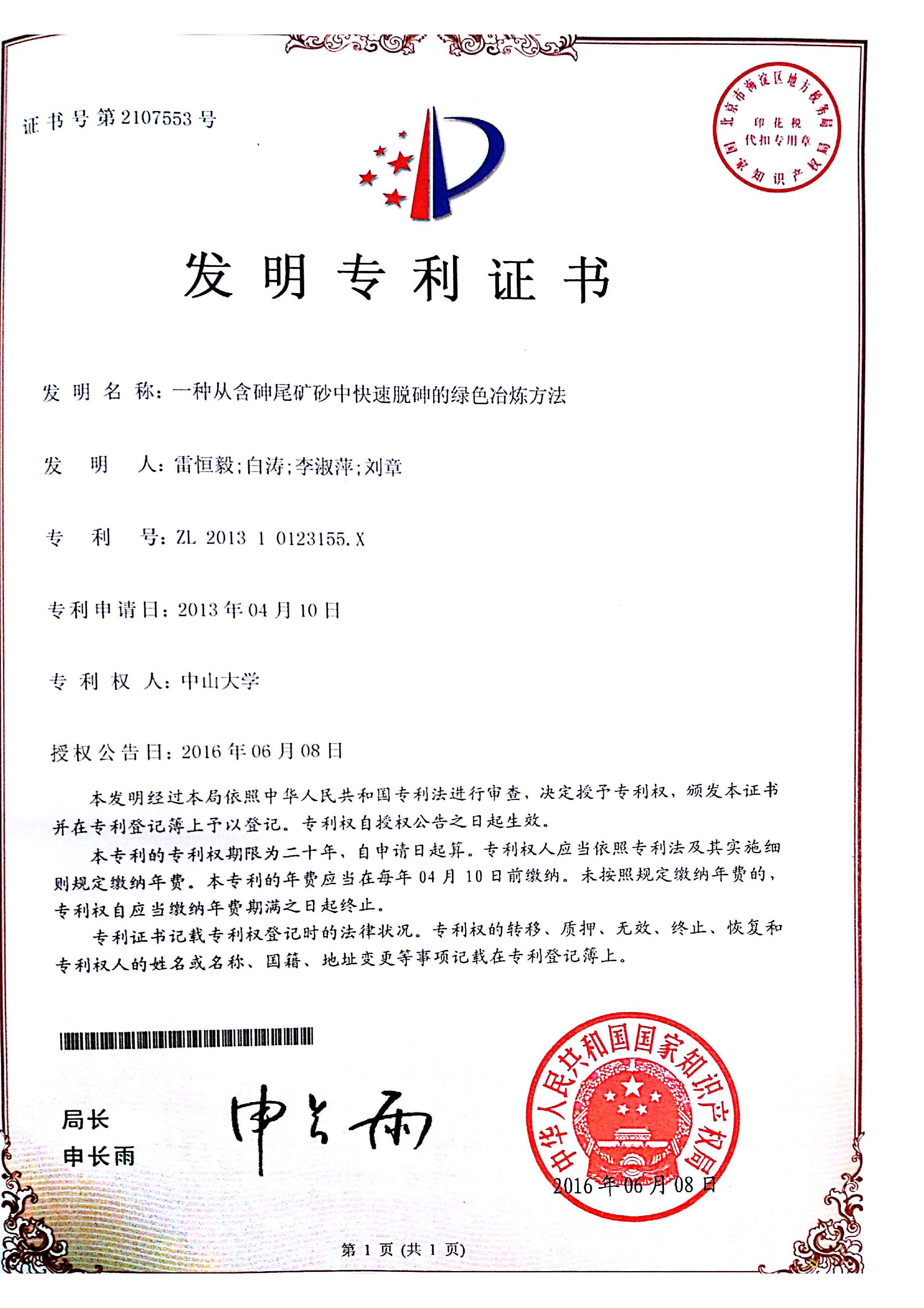 我校拟转让发明专利 “一种从含砷尾矿砂中快速脱砷的绿色冶炼方法”(ZL 2013 1 0123155.X)的发明人与意向受让方郴州高科创新产业孵化器有限公司存在关联关系,发明人雷恒毅曾经担任郴州高科创新产业孵化器有限公司监事职务。经委托由我校公开招标确认的七弦琴国家知识产权交易中心进行网上挂牌交易,现按照《yl23455永利集团科技成果转化规定》(中大科研〔2016〕5号)的规定,将该发明专利转让结果予以公示。公示期为15日,公示期自2018年3月15日至3月29日止。任何单位和个人如对此专利转让有异议,可于2018年3月29日下午5:00前以书面形式送交科学研究院产学研合作处(地址:南校区中山楼214房)。异议应当签署真实姓名或加盖单位公章,并注明联系方式,逾期不予受理。