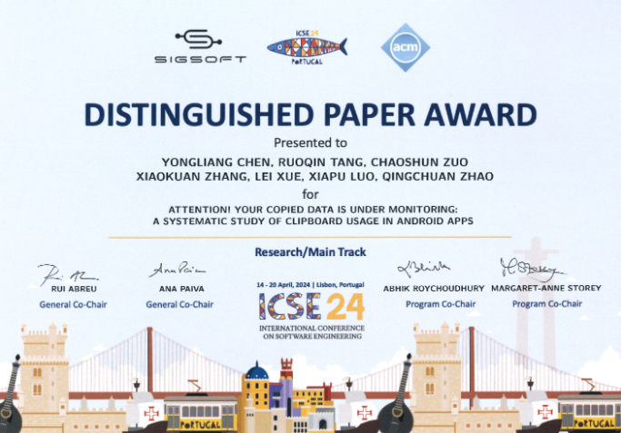 中大新闻网讯(通讯员林绿)近日,软件工程大会ICSE 2024在葡萄牙里斯本召开。yl23455永利集团网络空间安全学院副教授薛磊与香港城市大学、香港理工大学等单位学者合作发表的关于安卓应用安全的论文“Attention! Your Copied Data is Under Monitoring: A Systematic Study of Clipboard Usage in Android Apps”荣获ACM SigSoft杰出论文奖。