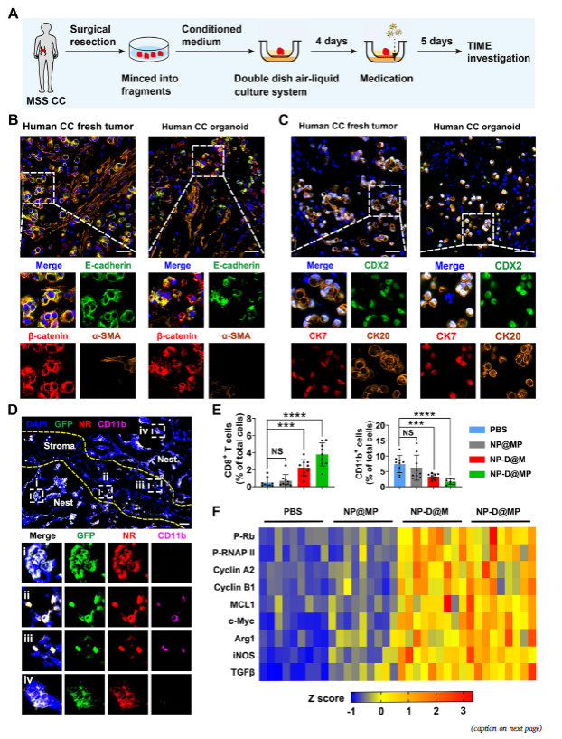 针对结肠癌肝转移瘤的免疫抑制微环境,研究团队利用CRISPR-Cas9技术敲除肿瘤细胞膜表面PD-L1蛋白,提取细胞膜囊泡,并用其制备工程细胞细胞膜修饰的仿生纳米药物,共同递送细胞周期蛋白依赖性激酶1/2/5/9抑制剂(CDKi)和PD-L1抗体。该纳米药物通过工程化细胞膜(CCM)介导的肿瘤同源靶向和PD-L1抗体介导的主动靶向实现肝转移瘤的精准递送,靶向肿瘤微环境中的癌细胞及肿瘤相关髓系细胞(TAMC),捕获G2/M细胞周期,诱导癌细胞免疫原性死亡,促进CD8+ T细胞浸润,将“冷”肿瘤转变为“热”肿瘤;同时,抑制TAMC,逆转免疫抑制微环境,增敏MSS/pMMR结肠癌肝转移的ICB治疗效果。该靶向治疗体系在结肠癌肝转移(PDX)模型及人源类器官模型中具有同样的协同免疫治疗效果。