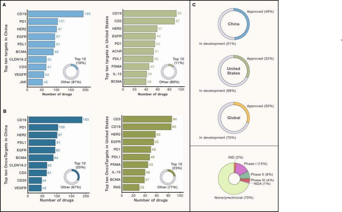 国内新药开发仍存在靶点同质化的问题。众所周知,新药研发存在高成本、长周期和低成功率等问题。许多本土生物制药公司会因投入产出的考量,选择开发较少风险的成熟靶点或者更快速的仿制药,导致国内药物研发面临靶点重复和适应范围重叠的问题(图2)。临床医生和基础科学家之间的有效沟通和合作仍然不足,中国开发的抗肿瘤药物大多来自于企业,来自院校和学术界的贡献相对较小,企业主导的临床研究对生物标志物或科学问题的探索也有限。中国的医生培养体系中,缺乏经过系统培训、同时精通临床和基础研究的医学科学家。此外,国内企业的国际竞争力以及区域间医疗资源的分配仍有待进一步提高。