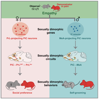 综合以上结果,该研究发现,在目睹同伴经历疼痛时,同伴的体液气味在雌雄小鼠中激活了不同的神经环路;在雌性小鼠中激活的PiC→PrL环路引起共情性社交亲近行为;在雄性小鼠中激活的PiC→MeA环路引起共情性自我梳理行为。这两条环路激活程度的差异由其基因表达模式上的性别差异所致。