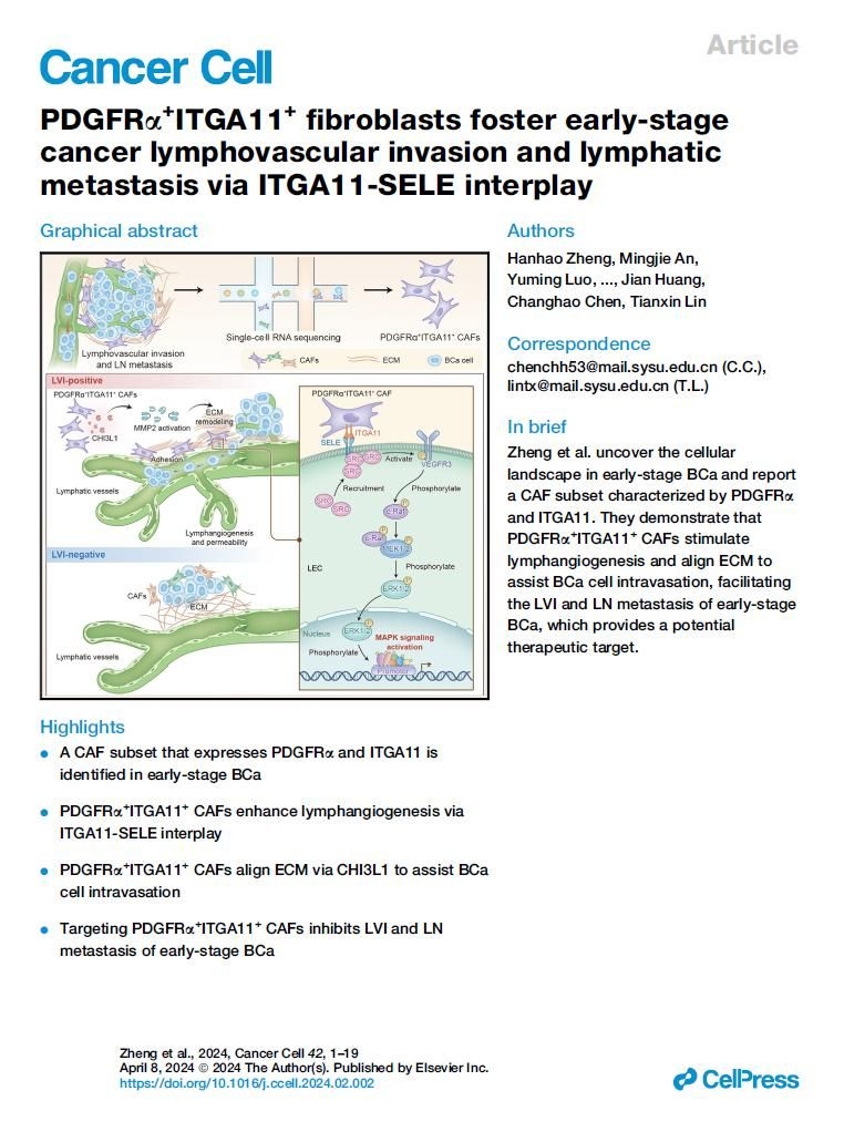 中大新闻网讯(通讯员林栩琪)淋巴转移是影响膀胱癌预后的最主要因素之一。在临床上,存在部分早期肿瘤负荷较小但却出现淋巴转移的膀胱癌,其预后极差,分子机制尚不清楚。近日,yl23455永利集团孙逸仙纪念医院林天歆教授团队揭示了肿瘤相关成纤维细胞亚群介导膀胱癌脉管癌栓形成的新机制,研究成果于2024年2月29日在国际顶级期刊《Cancer Cell》发表,题为“PDGFRα+ITGA11+ fibroblasts foster early-stage cancer lymphovascular invasion and lymphatic metastasis via ITGA11-SELE interplay”。