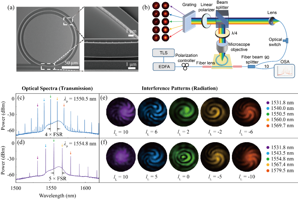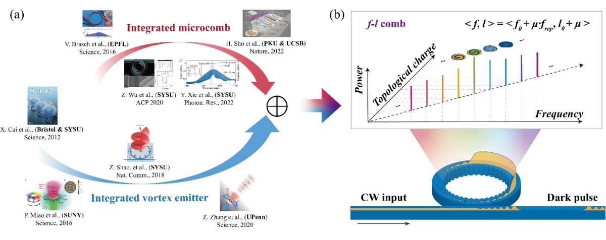 在过去的十多年里,基于片上集成器件对光的相干性在空间和频率维度的探索取得了显著进展,分别是集成涡旋光发射器和集成微腔光频梳(图1a)。其中,前者通过在微环侧壁上刻蚀角向光栅将腔内光场辐射到空间中形成携带轨道角动量(orbital angular momentum,OAM)的涡旋光束,后者则利用微环的Kerr非线性将连续波泵浦光转化为具有等频率间隔的多波长光源,即光学频率梳。