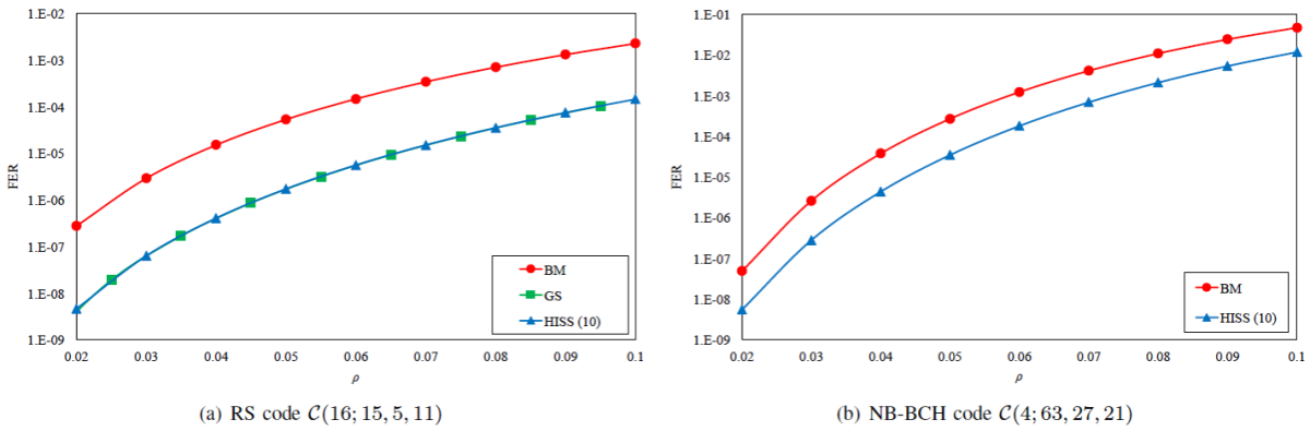 图1给出了两种多元循环码 — RS码和多元BCH码在Q元对称信道(QSC)下的译码性能。基于图中显示,迭代移加译码(HISS)相比BM译码可以获得十至百倍的纠错性能提升,实现了超限译码。该研究开启了循环码超限译码的全新路径,并由于其计算操作简单,可望在将来获得更大的工业应用。