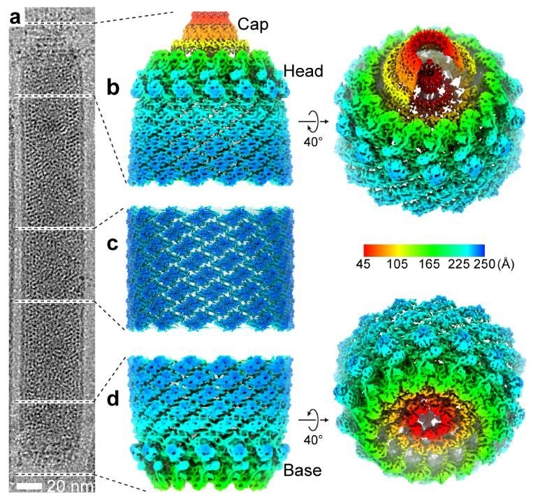 图a展示了一个杆状病毒AcMNPV病毒颗粒在冷冻电镜下的形象。图b,c,d分别展示杆状病毒AcMNPV的头部,螺旋柱体和尾部的三维结构。