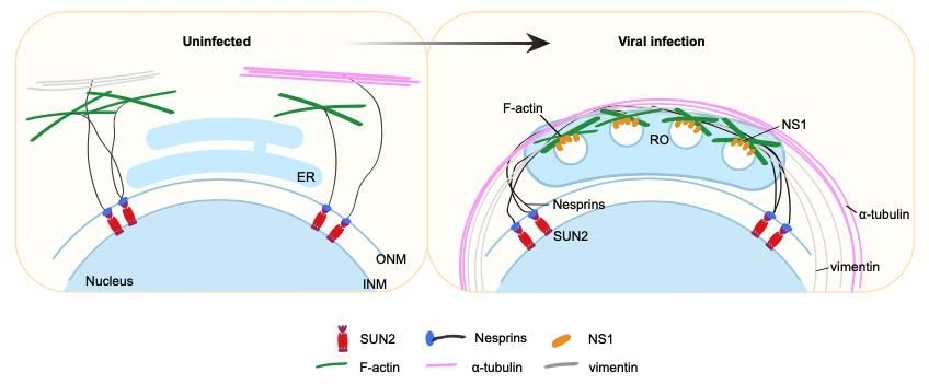 最后,研究人员利用病毒感染的乳鼠模型,证实SUN2敲除使得寨卡病毒在动物体内的复制、传播和致病力都大大减弱。综上所述,该论文阐明了核膜蛋白SUN2促病毒的机制是:SUN2与Nesprins共同作用,促进NS1-actin诱导的细胞骨架重塑和复制囊泡的形成,调控黄病毒RNA的合成(图1)。这也提示除了细胞质骨架,细胞骨架系统的其它蛋白(如核膜蛋白SUN2和Nesprins)也是黄病毒复制的关键因子。
