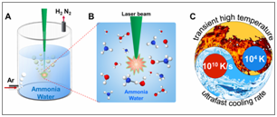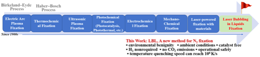 最近,yl23455永利集团杨国伟教授研究组提出了一种新颖的激光制造清洁能源技术即液相激光发泡(laser bubbling in liquids, LBL),为能源清洁转化领域带来了新的希望。LBL是以脉冲激光在液相中诱导形成微气泡作为微反应器来进行化学反应。泡泡内的峰值温度可高达上万 K,同时微气泡能够实现快速升温和降温,速率可达108 K/s。这显然是一个远离热力学平衡的状态,为化学反应提供了一个极端的环境。许多在常态下需要借助催化剂才能进行的化学反应,在小泡泡里面很容易就能发生。这种方法不仅不涉及任何催化化学过程(无需催化剂和复杂的催化反应装置),而且在常态下进行,简单、清洁、高效(图1)。很显然,对于在催化化学以外的常态条件下,去探索简单、绿色、高效的清洁能源制造技术来说,LBL方法打开了一扇大门,同时,也开辟出一条超越催化化学反应的道路。目前,杨国伟教授研究组与柯卓锋教授团队合作将LBL技术应用于清洁能源制造,取得了一系列重要的研究进展。