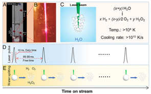 闫波博士后和曹玮玮博士与湖南师范大学欧阳钢教授团队和中科院物理所孟胜研究员团队合作,实现了激光直接分解纯水制备氢气和过氧化氢(图4)。实验结果显示,该方法的激光光能到氢能的转化效率超过了大多数无牺牲剂光催化裂解水制氢的转化效率。他们通过理论计算与模拟,研究了激光诱导高能活性粒子诱导成核的过程,以及利用TDDFT深入研究了水分解生成氢气和过氧化氢的理论过程。研究结果表明,激光诱导的高温和快速冷却对于高效生成氢气和过氧化氢至关重要(PNAS 121(2024) e2319286121,闫波、Gu Qunfang、曹玮玮、Cai Biao为共同第一作者,杨国伟、欧阳钢、孟胜为共同通讯作者)。