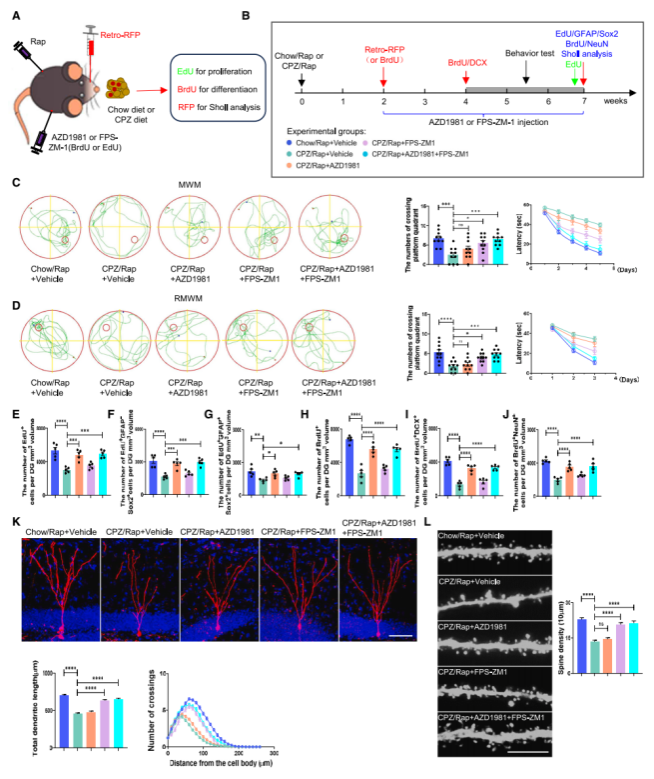 在脱髓鞘海马中,神经干细胞的分化、新生神经元的发育和功能连接受到抑制。团队发现CPZ/Rap小鼠海马内未成熟神经元和成熟神经元的细胞数量减少,RFP+新生神经元的树突长度、复杂度和新生神经元之间的连接受损,证实CPZ/Rap抑制了NSCs的分化和新生神经元的发育和功能连接(图2)。