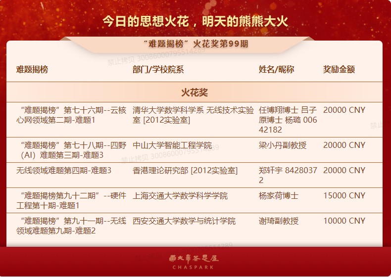 2021年11月以来,华为向全社会发布产业中遇到的兼具商业价值和科学价值的挑战难题,通过难题揭榜的形式,吸引基础理论扎实、具有创新解题思路的人才参与,并设立“难题揭榜”火花奖,表彰和激励在解决产业难题及科学理论突破方面做出重大贡献的高校教师和研究人员。