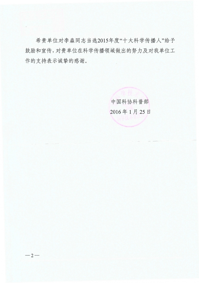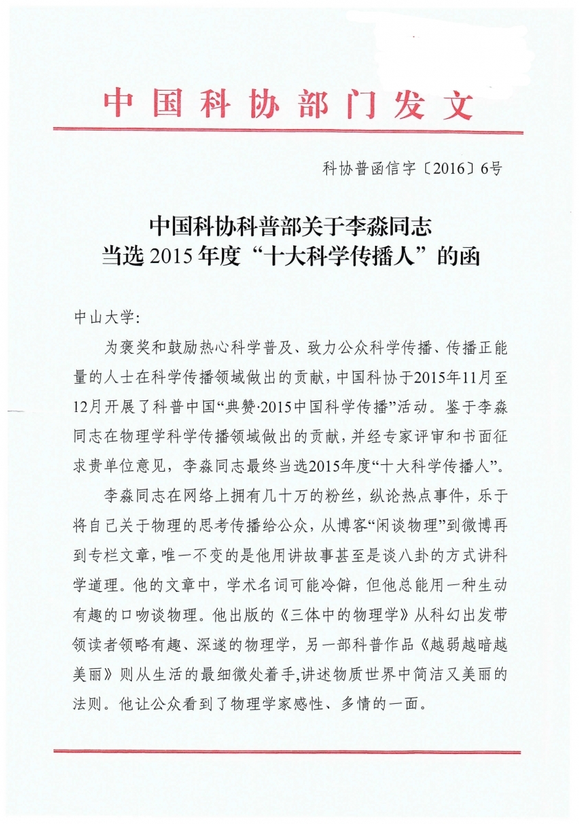 导航痕迹 首页 科研动态 中国科协科普部关于李淼同志当选2015年度“十大科学传播人”的函 中国科协科普部关于李淼同志当选2015年度“十大科学传播人”的函 发布人:科学研究院 发布日期:2016-02-23