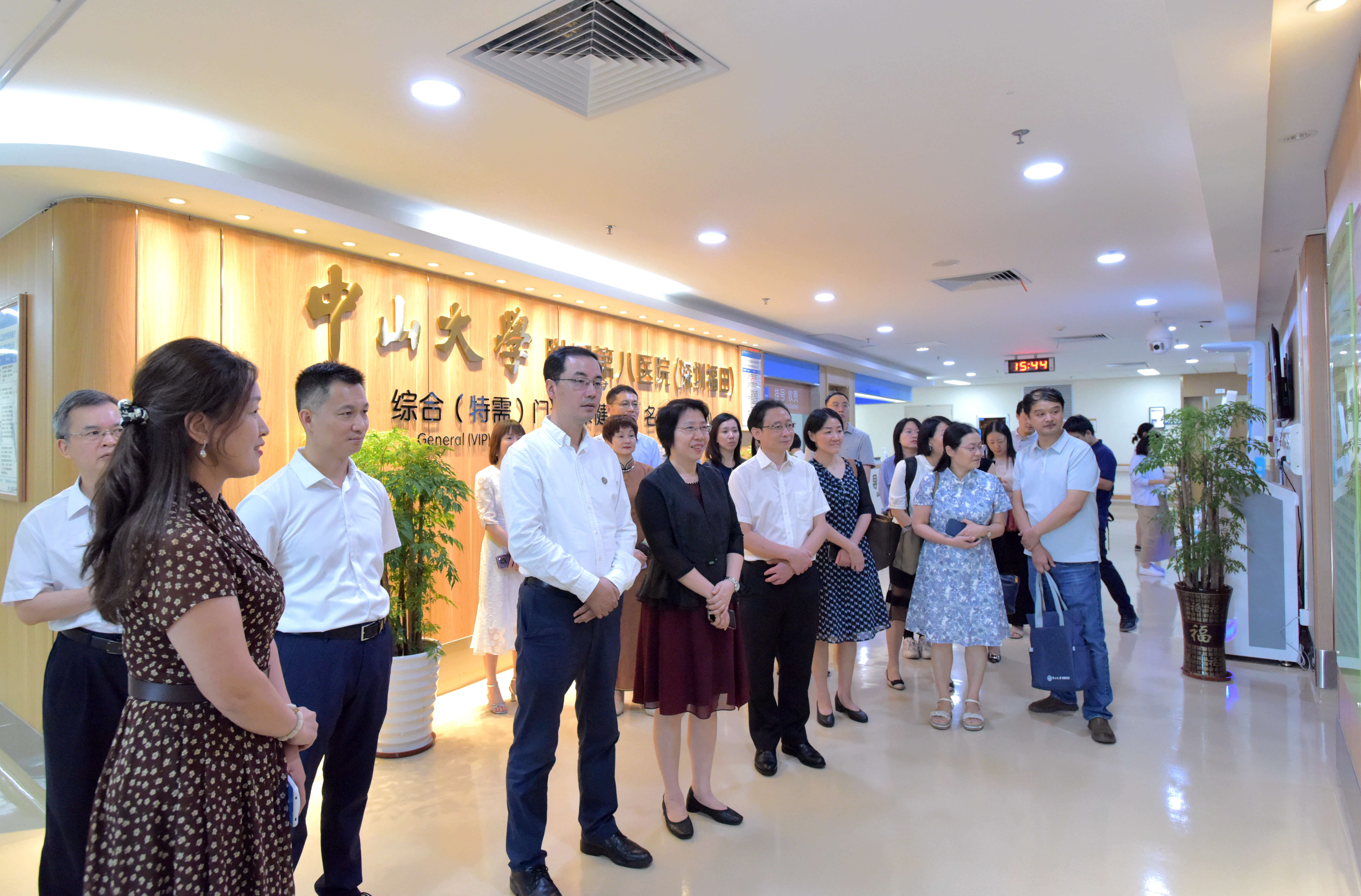 随后,调研组一行来到医院,参观智慧病房、中大名医诊疗中心、“医者仁”碑石,并与医院领导班子成员、相关职能科室负责人、临床重点学科带头人座谈。附属第八医院副院长王彤、王鹏分别汇报了医院整体发展情况和实验室建设情况。科学研究院、先进技术研究院相关负责人围绕实验室定位、建设、运营等与医院同事详细交流,逐一把脉问诊。