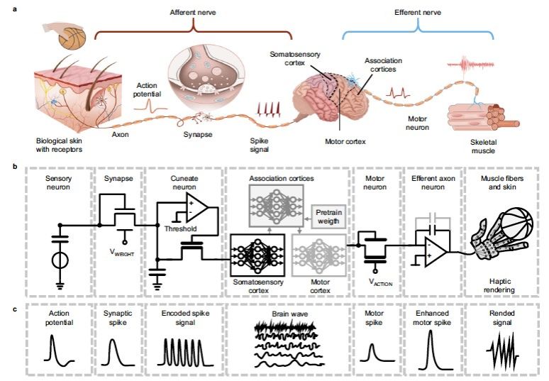 信号与系统的架构设计是定义一个新领域的前提。与传统的力触觉信号与系统不同,类人类皮肤的机器触觉系统是基于神经形态并仿生人类触觉的工作原理。区别于传统模式,信号特性及其处理方式也大不相同,其基础信号是神经尖峰脉冲(Spike)而非传统的数字和模拟混合信号;其计算范式是基于矩阵乘法的模拟计算,而非基于布尔逻辑的冯诺依曼数字计算。