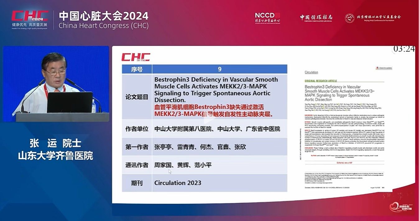 中大新闻网讯(通讯员宋兰桂)日前,中国心脏大会(CHC)2024在北京开幕。会上公布了2023年度中国十大心血管基础研究,附属第八医院黄辉教授团队和中山医学院周家国教授团队合作发表在心血管领域顶尖学术期刊《循环》(Circulation)的论文“Bestrophin3 Deficiency in Vascular Smooth Muscle Cells Activates MEKK2/3–MAPK Signaling to Trigger Spontaneous Aortic Dissection(血管平滑肌细胞Bestrophin3缺失通过激活MEKK2/3-MAPK信号触发自发性主动脉夹层)”入选2023年度中国十大心血管基础研究。