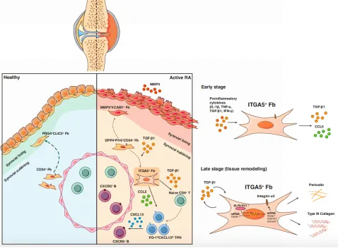 ITGA5+滑膜成纤维细胞在RA活动期患者及淋巴细胞浸润型滑膜炎中上调,可能与RA的治疗抵抗性相关。这一细胞亚群可能源自DPP4+PI16+CD34+成纤维细胞的分化。ITGA5+滑膜成纤维细胞可能在滑膜炎症的早期阶段出现,并通过分泌TGF-β1诱导幼稚CD4+ T细胞向CXCL13hi PD-1hi TPHs方向分化。关节腔内注射ITGA5+滑膜成纤维细胞会加重胶原诱导关节炎小鼠的滑膜炎症和骨破坏。